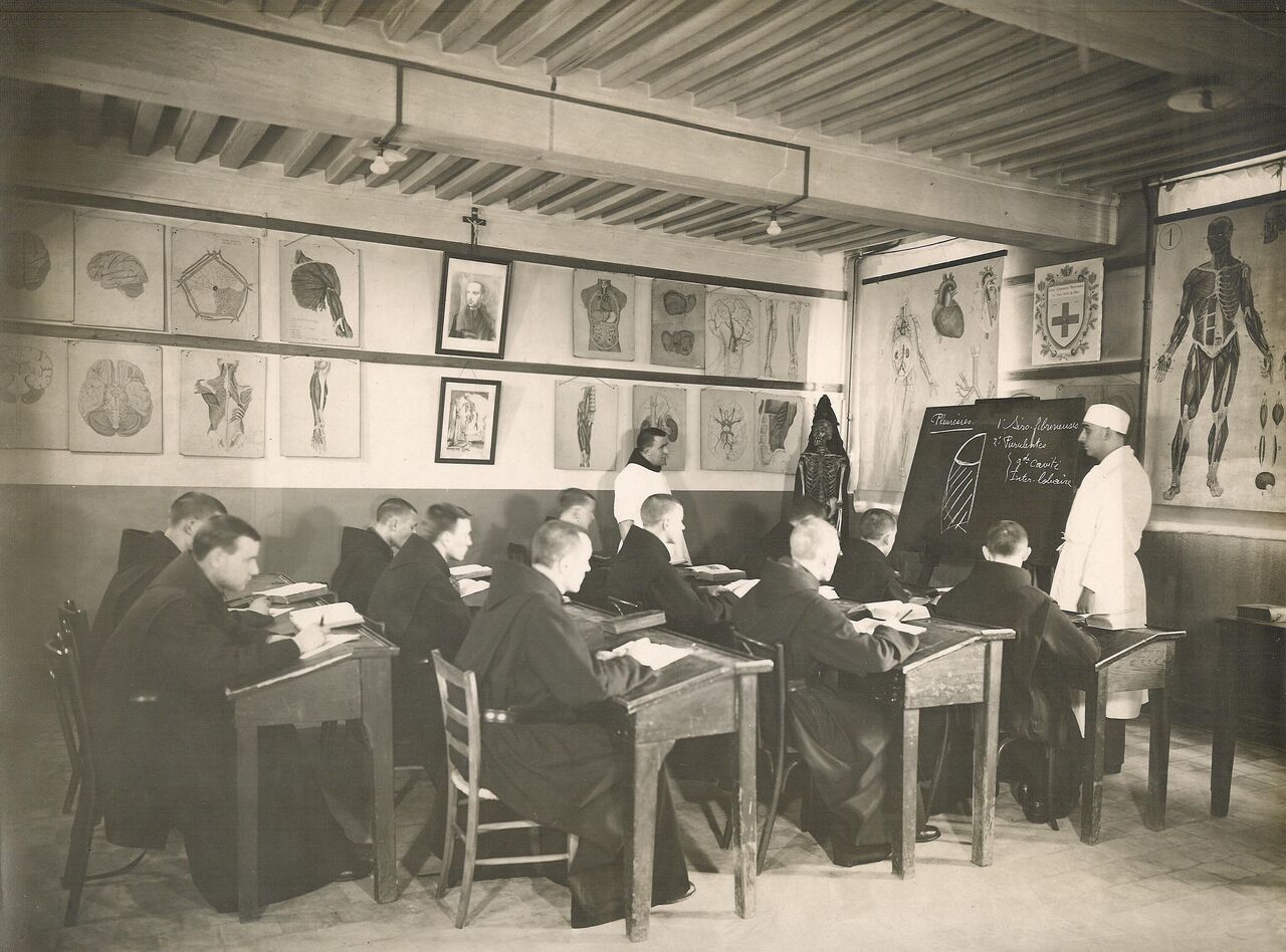 Dans la plupart des hôpitaux de France, le personnel soignant est incarné pendant longtemps par quelques médecins fonctionnaires qui ne se font appeler psychiatres qu’au cours du XXe siècle. Les religieux de l’établissement lyonnais, dont la vocation principale est l’hospitalité et le soin, se forment officiellement à partir des années 1920 à la fonction d’infirmier (fig. 3).