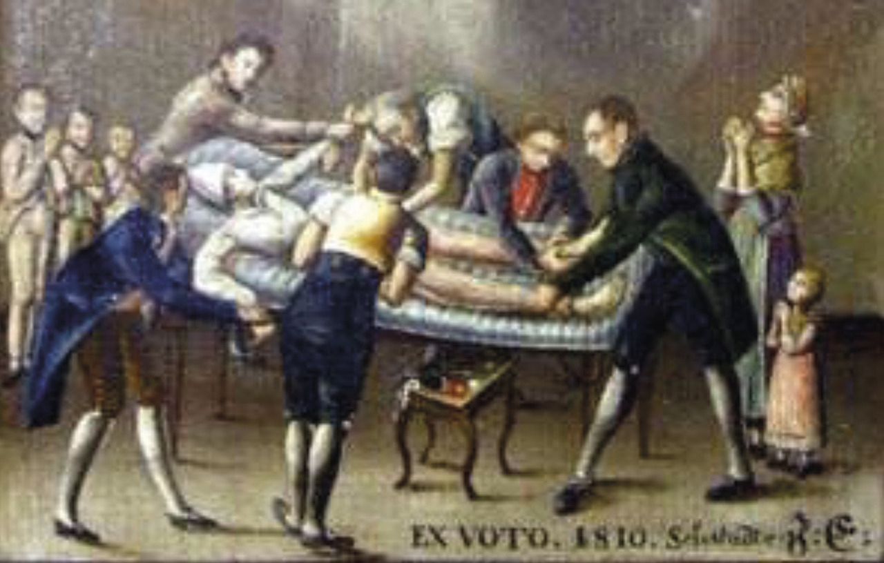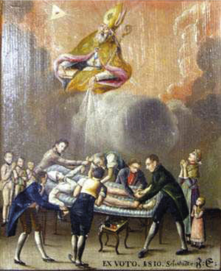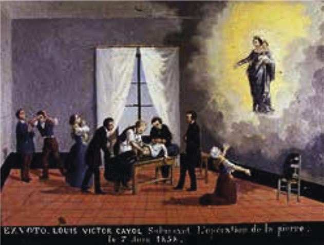 Que pouvait-on faire en 1810 pour un homme souffrant de la gravelle ? Où en était le traitement chirurgical ? Jean Baseilhac, connu sous le nom de frère Cosme, et qui soigna Rousseau, est mort (1703-1781) ; Jean Civiale, né en 1792 et qui mourra en 1867, n’a pas encore imaginé le traitement des calculs rénaux par la lithotritie, autrement dit leur destruction in situ par broyage ou par dissolution. Il ne peut donc s’agir que de l’extraction de calculs par voie basse, sans qu’on ne sache rien de l’instrumentum choisi, le tableautin étant trop imprécis. Cette présence médicale sur un ex-voto alsacien de malade guéri par les soins combinés de l’Église et de la Faculté est assez rare pour que nous ayons choisi de faire une étude de ce tableau qui apporte moins sur l’histoire de la chirurgie que sur celle de l’attitude à l’égard de la maladie et de la conduite au lit du malade.**, 4