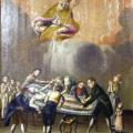 Six hommes (dont aucun ne porte la perruque, mais qui sont en culotte et bas blancs) s’affairent sur son corps non anesthésié, dont on ne voit ni l’abdomen ni les cuisses, par groupe de deux, tous en habit bourgeois. Ceux de la tête du lit tiennent ses mains et lui écartent largement les bras ; ceux du pied maintiennent ses chevilles pour qu’il garde les jambes suffisamment écartées, permettant au troisième duo de travailler. Tous deux ont laissé tomber la veste, ont retroussé les manches de leurs chemises et se penchent sur le bas-ventre invisible ; celui qu’on voit de face, front chauve et cheveux gris, rapproche ses deux mains en un geste qu’on imagine plein d’expérience mais qu’on ne voit pas précisément.