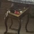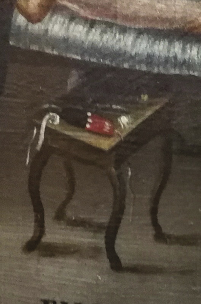 Sur une petite table basse à pieds arqués sont rangés quelques objets difficilement reconnaissables, sauf peut-être une sorte d’étui rouge et noir pourvu d’un cordon, une bande de linge blanc, et des instruments métalliques, qui brillent.