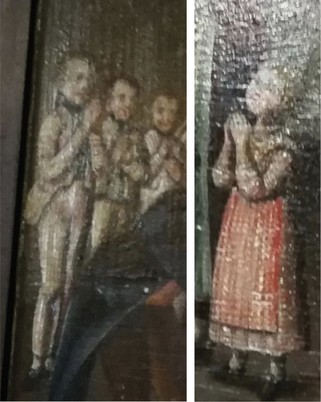 À la tête du lit de fortune, trois jeunes gens en rang d’oignons, en tenue bourgeoise, prient, les mains jointes ; au pied prient aussi, avec concentration, le regard tourné vers le saint évêque, une dame et sa fillette, jolie tache de couleur avec son tablier rouge, qui rappelle le gilet rouge de l’un des praticiens. L’intervention est aussi une affaire de famille.