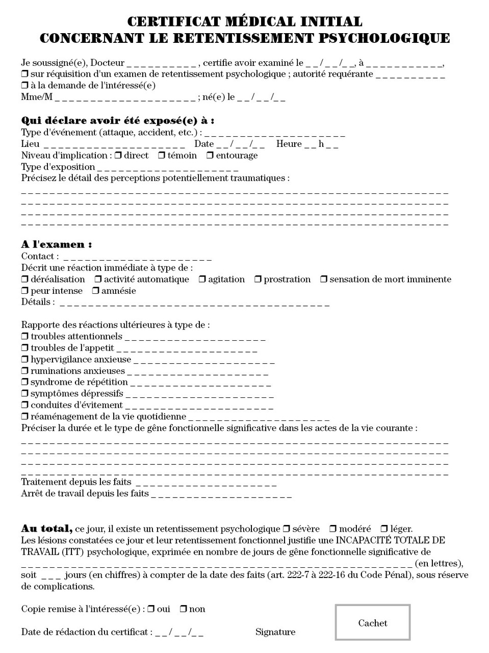 À l’occasion du dispositif de prise en charge hospitalière des victimes d’attentats mis en place à l’hôpital Hôtel-Dieu en novembre 2015, des certificats médicaux initiaux de retentissement psychologique mentionnant l’ITT ont été systématiquement établis. Cette préconisation a été reprise dans le référentiel national des cellules d’urgence médicopsychologique (CUMP).3 Nous proposons un modèle qui peut aider tout praticien à l’établissement de ce certificat (