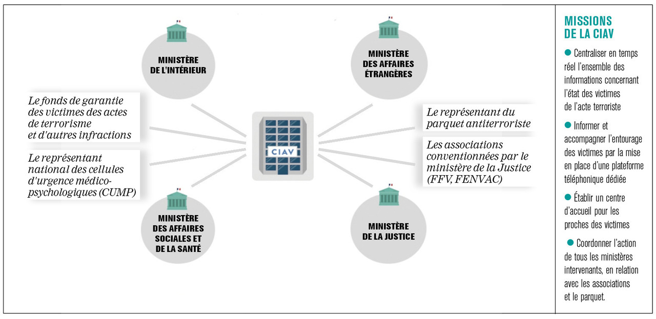 Au niveau de la politique publique, la délégation interministérielle à l’aide aux victimes, qui a relayé en aout 2017 le secrétariat d’état à l’aide aux victimes, vise à améliorer la coordination dans la prise en charge immédiate des victimes de terrorisme. Il est en charge de la cellule interministérielle d’aide aux victimes (CIAV), dont les missions sont précisément de centraliser les données concernant les impliqués, d’informer et d’accompagner la victime et son entourage, de coordonner l’action de tous les ministères intervenants, en relation avec les associations et le parquet (