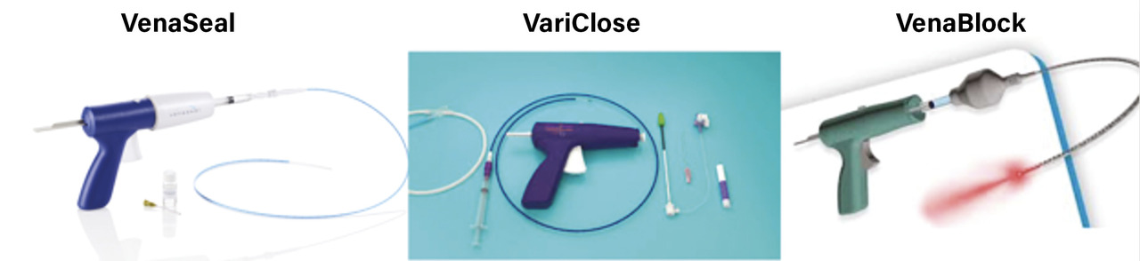 Les systèmes VariClose et VenaBlock utilisent aussi le cyanoacrylate, mais sous une forme plus liquide, avec un matériel relativement similaire, sauf le système de retrait qui est continu (Essais contrôlés randomisés