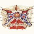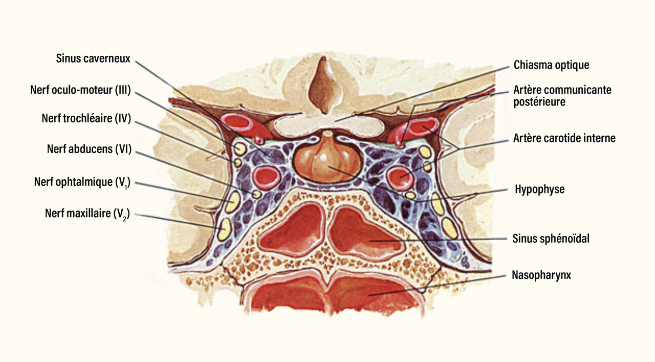 - une paralysie oculomotrice liée à une compression des nerfs crâniens (III, IV et VI) dans le sinus caverneux (fig. 1) ;
