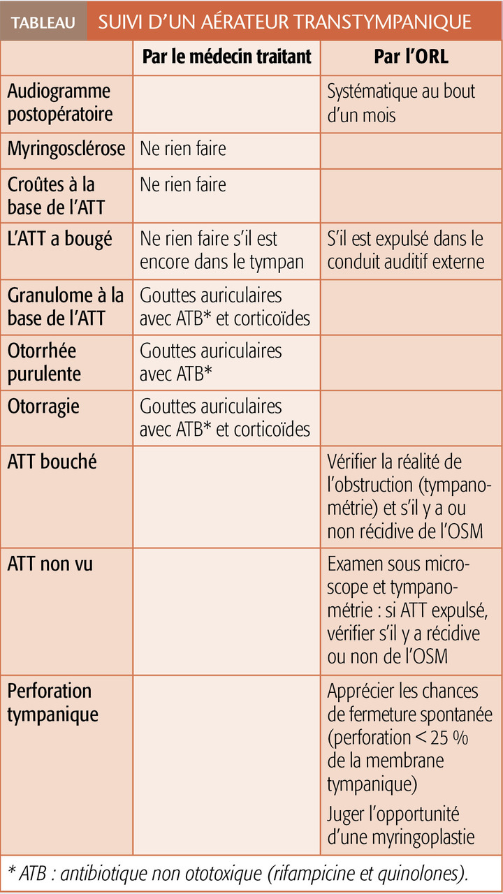 Myringosclérose (plaque calcaire blanche opaque) : sans conséquence clinique. Elle survient aussi chez des enfants qui n’ont jamais eu d’ATT mais ont fait beaucoup d’OMA.