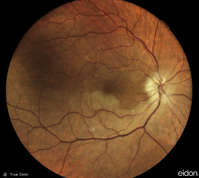 La baisse d’acuité visuelle est profonde, brutale, indolore et survient généralement sur un terrain cardiovasculaire. L’examen clinique met en évidence une pupille en mydriase aréflexique avec abolition du réflexe photomoteur direct et conservation du réflexe consensuel à l’éclairement de l’œil adelphe. La rétine est pâle, signe d’un œdème blanc rétinien ischémique des couches internes, avec une macula d’aspect rouge cerise associée à un rétrécissement diffus du calibre artériel et inconstamment à un embole artériel visible (fig. 3). Un athérome carotidien, une dissection carotidienne (sujet jeune), une cardiopathie emboligène ou encore une maladie de Horton sont à rechercher en urgence (tableau).