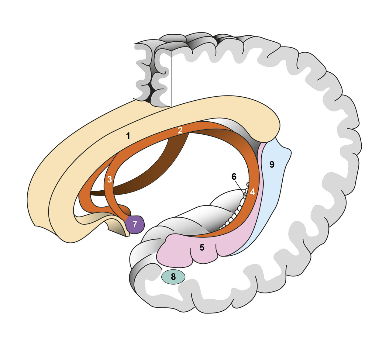 Le gyrus limbique se place en dedans de cette fissure et recouvre donc une partie des lobes frontal, pariétal et temporal. Il est formé des gyrus subcalleux, cingulaire et parahippocampique (cinquième gyrus temporal T5). Le gyrus parahippocampique possède une partie postérieure, l’isthme, qui communique avec le gyrus cingulaire et une face supérieure aplatie, le subiculum.