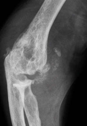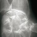 - un interligne longtemps conservé (contrairement aux autres rhumatismes destructeurs) [fig. 3] jusqu’au stade de goutte chronique et l’absence de raréfaction osseuse périarticulaire permettant de différencier la goutte d’autres arthropathies ; à un stade avancé, la goutte tophacée peut avoir un potentiel destructeur à la fois articulaire et osseux (fig. 4).