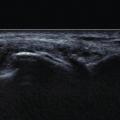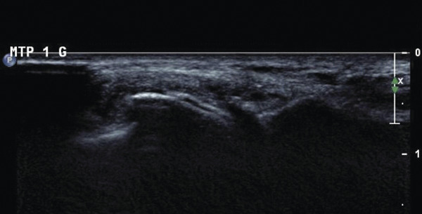 L’échographie peut montrer un aspect dit en « double contour » (fig. 5), correspondant à des dépôts uratiques à la surface des cartilages hyalins et un aspect de synovite en « tempête de neige » chargée en cristaux d’urate.