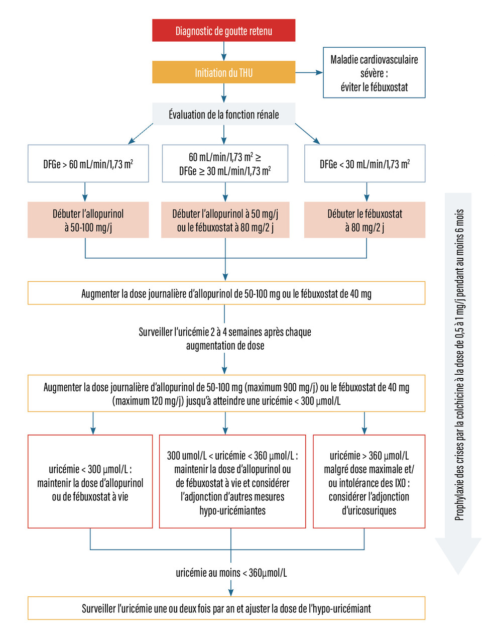 Le but du traitement hypo-uricémiant est de dissoudre les cristaux et d’empêcher leur formation. La valeur cible (uricémie) du traitement hypo-uricémiant doit être inférieure à 60 mg/L ou 360 mmol/L, voire, si possible, inférieure à 50 mg/L (300 mmol/L), chez tous les goutteux (a fortiori en cas de tophus). Une fois l’uricémie cible atteinte, l’observance du traitement doit être maintenue et l'uricémie contrôlée une ou deux fois par an. Le patient doit être informé du risque de crise de goutte paradoxale à l’instauration du traitement hypo-uricémiant ; une titration progressive des hypo-uricémiants et une prophylaxie de la crise permettent de limiter ce risque. La prophylaxie des crises repose sur la colchicine (de 0,5 à 1 mg) ou un AINS (avec gastroprotection si nécessaire). Cette chimioprophylaxie doit être poursuivie pendant environ six mois (idéalement jusqu’à l’atteinte de l’uricémie cible), et la colchicine doit être privilégiée par rapport aux AINS si elle est bien supportée et qu’il n’y a pas de contre-indication (fig. 6).