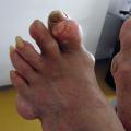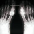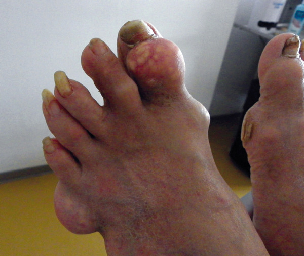 - l’apparition de tophus sous-cutanés, décelables ou non cliniquement, lésions les plus caractéristiques de cette phase de goutte articulaire chronique, fonction de la durée et de la sévérité de l’hyperuricémie, touchant le plus fréquemment les doigts, les poignets, les oreilles, les genoux, les pieds (fig. 2), l’olécrane et les points de pression (face ulnaire de l’avant-bras, tendon d’Achille) ;