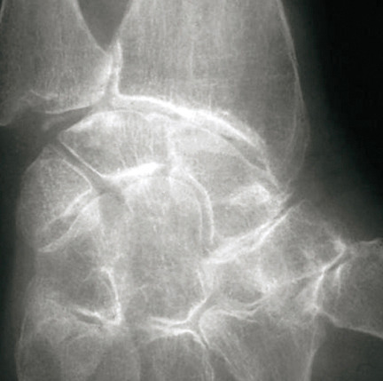 La forme pseudorhumatoïde est rare (5 %), simulant une polyarthrite rhumatoïde. L’arthrite chronique à PPC se présente comme une oligo- ou une polyarthrite, avec parfois des signes systémiques d’inflammation (élévation de la vitesse de sédimentation et de la protéine C-réactive [CRP]). La superposition d’accès aigus microcristallins est évocatrice de ce diagnostic. Il s’agit d’un diagnostic différentiel de polyarthrite rhumatoïde du sujet âgé ou de pseudopolyarthrite rhizomélique. Le diagnostic repose sur la mise en évidence des cristaux de PPC, même si les radiographies standard sont évocatrices. L’atteinte radiographique associe des calcifications des cartilages articulaires (fig. 7) et des fibrocartilages (fig. 8, 9, 10 et 11) [à rechercher systématiquement sur les radiographies de poignets, genoux et symphyse pubienne]. La mise en évidence d’une chondrocalcinose sur des radiographies standard renforce le diagnostic de rhumatisme à PPC mais l’absence de dépôts calciques ne l’élimine pas (la sensibilité de la radiographie standard étant imparfaite). L’échographie peut mettre en évidence des dépôts de PPC, qui apparaissent comme une fine bande hyperéchogène au sein des cartilages hyalins et comme des points scintillants dans les fibrocartilages ou dans la membrane synoviale. La sensibilité de l’échographie est bien supérieure à celle de la radiographie standard. Le scanner peut également mettre en évidence des dépôts calciques évocateurs, notamment au niveau du rachis ou du bassin qui sont plus difficilement explorés par les radiographies et l’échographie.