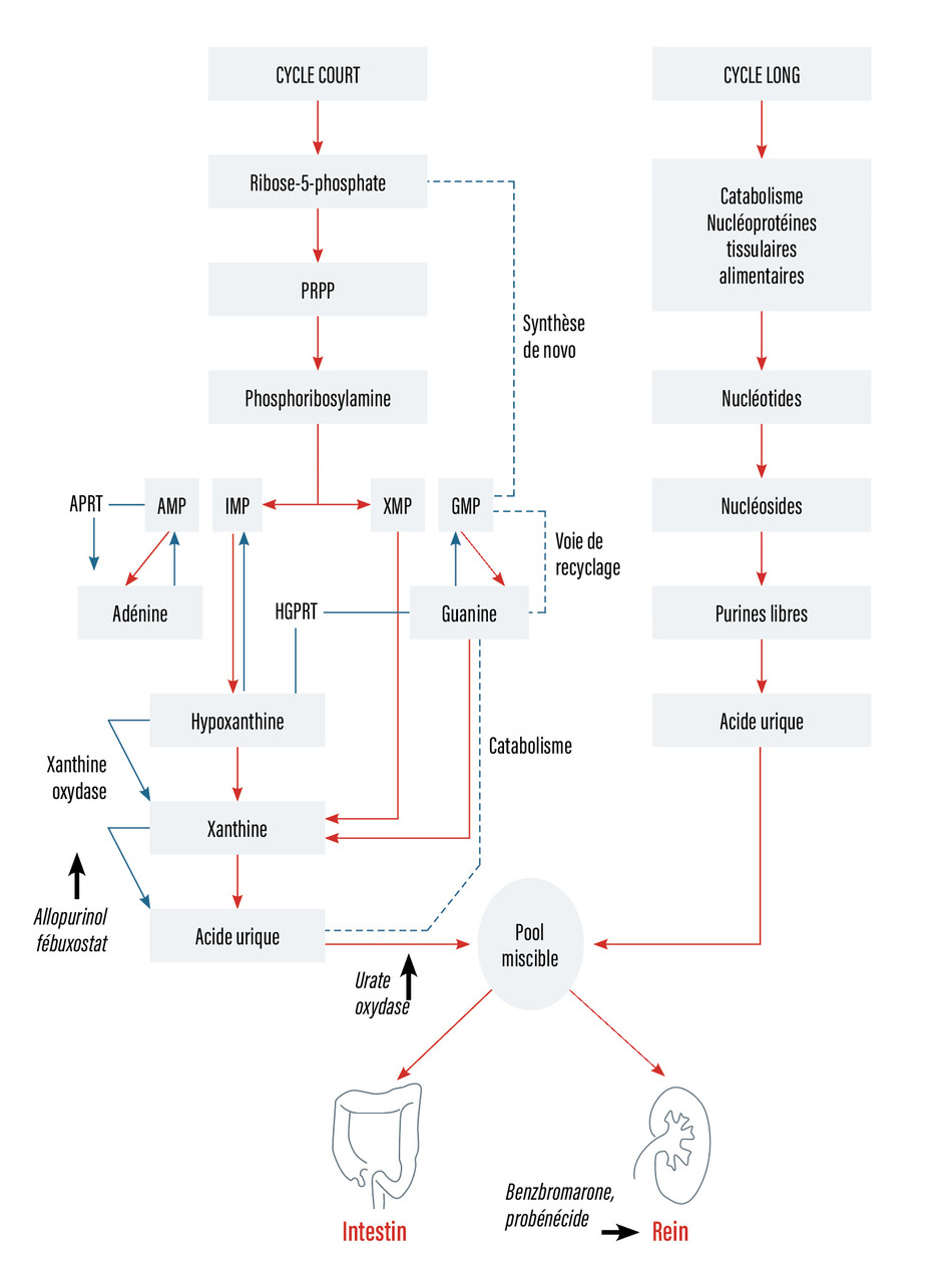 L’acide urique est le produit final de la voie métabolique des purines. L’adénine et la guanine sont des éléments essentiels pour la synthèse de l’acide nucléique quand ils sont convertis en ribonucléosides et ribonucléotides, précurseurs de l’ARN, l’ADN et l’AMP cyclique. La voie métabolique est résumée dans la fig. 1 et montre que :