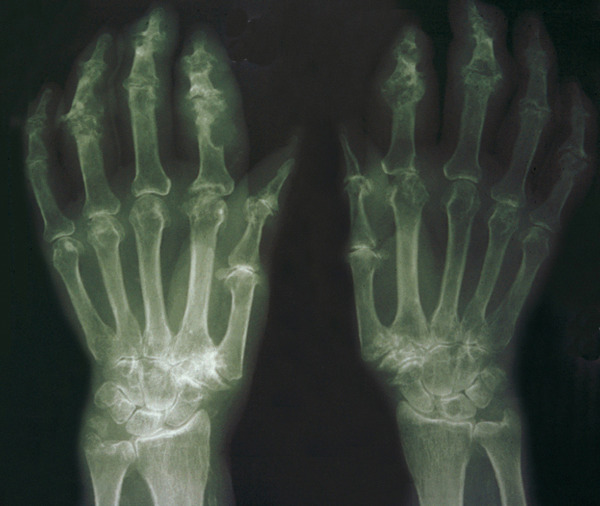 Les radiographies permettent de déceler des modifications ostéocartilagineuses asymétriques (mains, pieds, poignets, coudes, genoux), secondaires à la réaction inflammatoire autour des tophus, comportant :