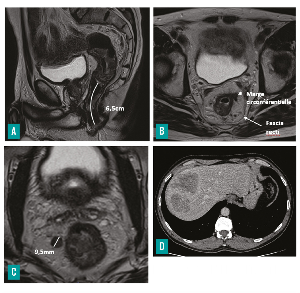 – la marge circonférentielle (CRM) : distance la plus courte en millimètres entre le bord externe de la tumeur ou d’une adénopathie, d’un nodule tumoral, d’un embole vasculaire extramural et le fascia recti, ainsi que sa localisation horaire (