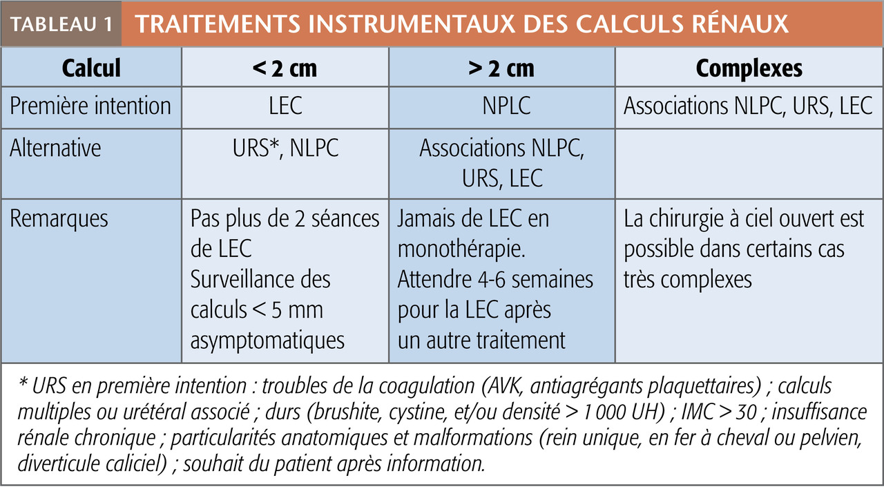 Les approches actuellement disponibles sont la lithotritie extracorporelle (LEC), l’urétéroscopie (URS), l’urétérorénoscopie (URSS), la néphrolithotomie percutanée (NLPC) et, de façon plus anecdotique, la chirurgie laparoscopique ou à ciel ouvert (tableaux). Ces techniques sont complémentaires et parfois concurrentes. Dans certains cas, elles sont associées (successivement ou dans le même temps opératoire) pour augmenter l’efficacité.2-4
