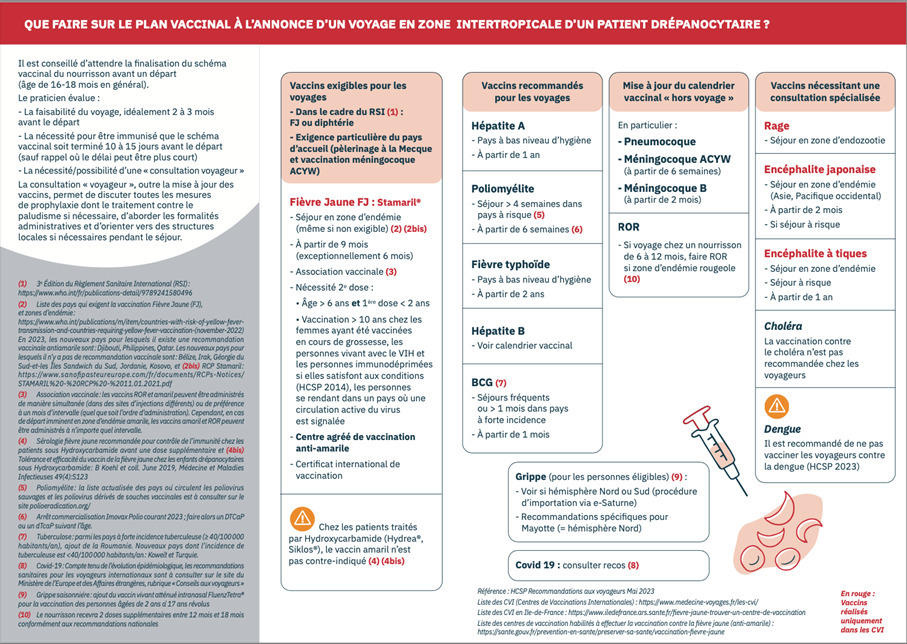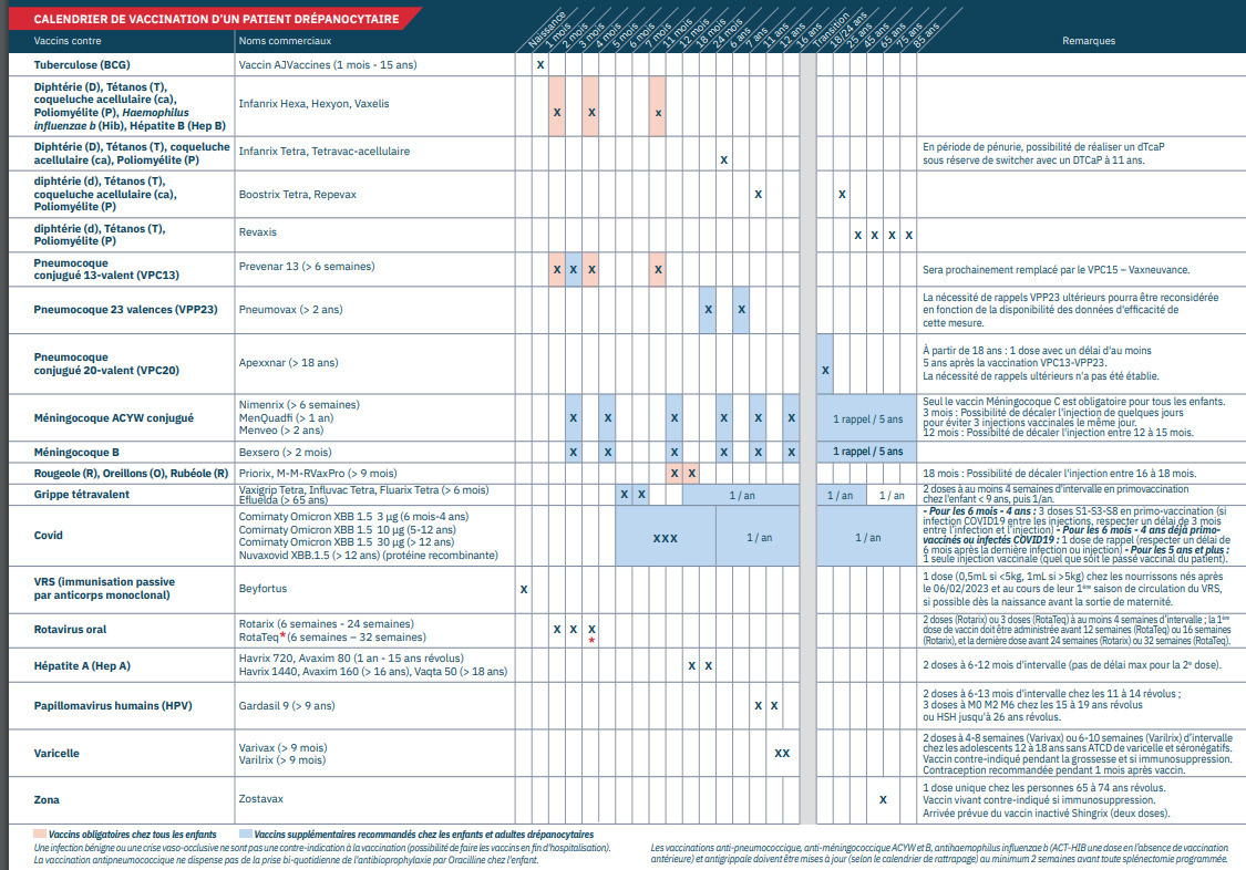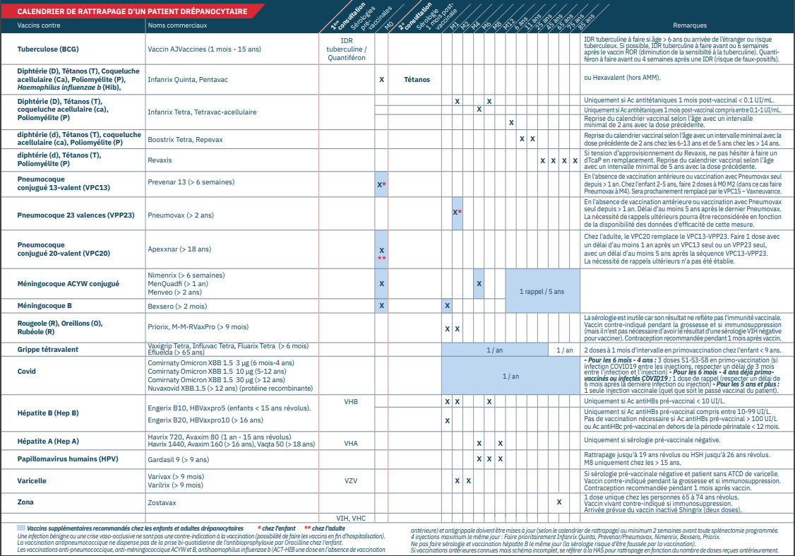 Les schémas vaccinaux de l’enfant et de l’adulte atteints de drépanocytose, renforcés par rapport à la population générale, sont complexes, diffèrent en fonction de l’âge du patient et des vaccins réalisés antérieurement, et les recommandations évoluent annuellement. En pratique quotidienne, il est ainsi souvent difficile d’en faire la synthèse, aboutissant parfois à des retards vaccinaux.