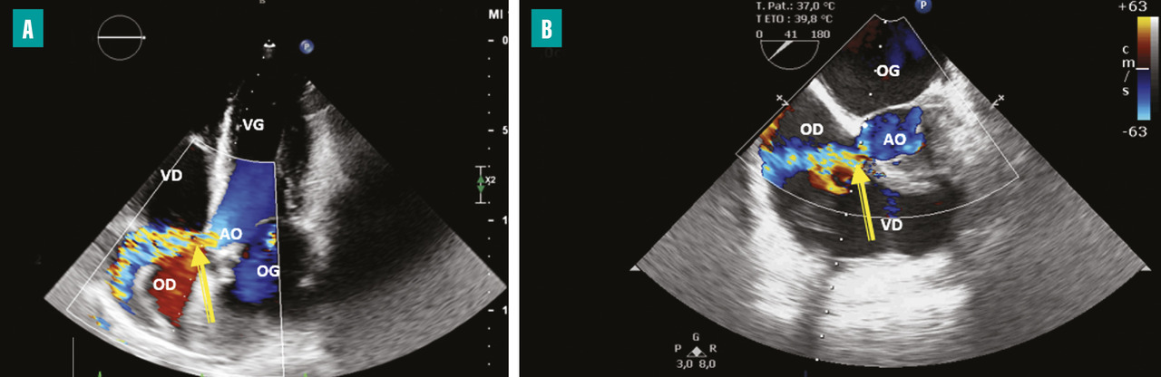 L’apparition à l’échographie cardiaque d’un abcès périvalvulaire ou périprothétique aortique (fig. 3 ) ou mitral est une complication grave de l’EI. L’abcès est plus fréquent dans les EI sur prothèses valvulaires (50 à 80 % contre 10 à 40 % sur valves natives). L’ETO est plus sensible que l’ETT pour ce diagnostic (notamment pour les localisations postérieures)2 et le scanner cardiaque est très performant pour la recherche d’abcès sur prothèse. La détersion de l’abcès peut être à l’origine de fistules entre les différentes cavités cardiaques (fig. 4 ). La fistulisation se fait le plus souvent dans la chambre de chasse du ventricule gauche. Les fistules intracardiaques dans l’oreillette gauche ou droite peuvent être à l’origine d’un tableau d’insuffisance cardiaque et compliquent le geste chirurgical.