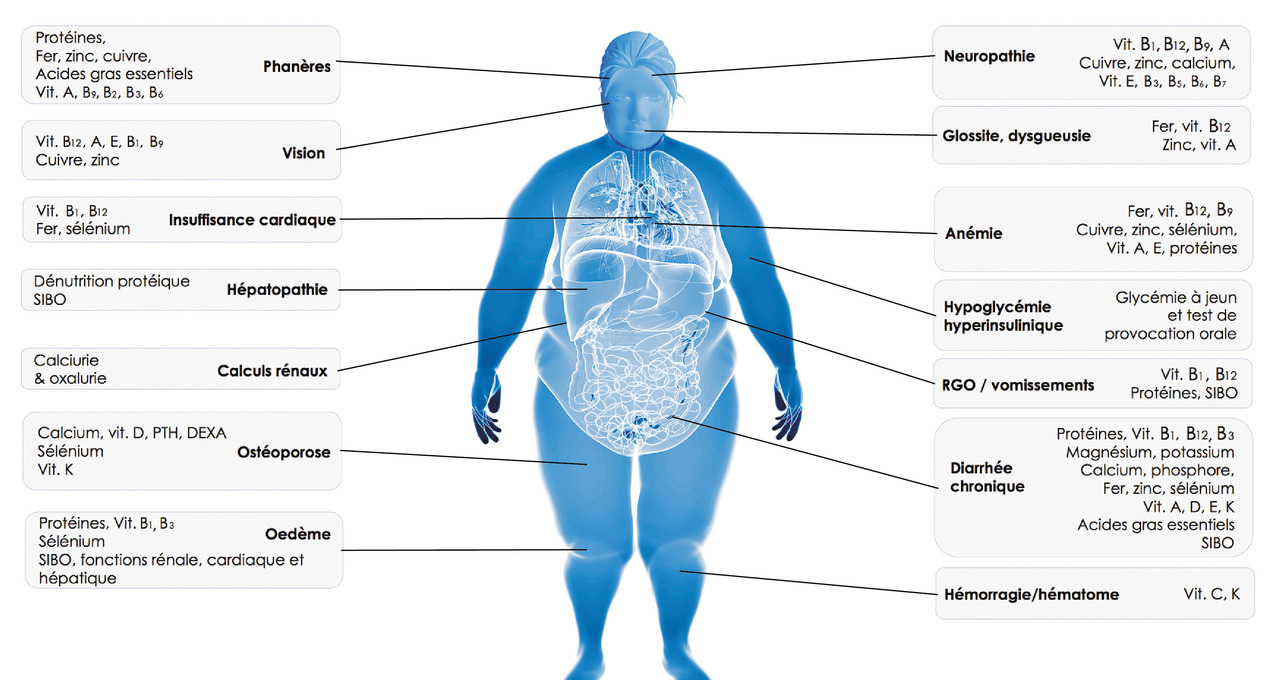– une surveillance biologique des vitamines et oligo-éléments (tous les trois à six mois en période de perte de poids, au moins annuelle ensuite) ;