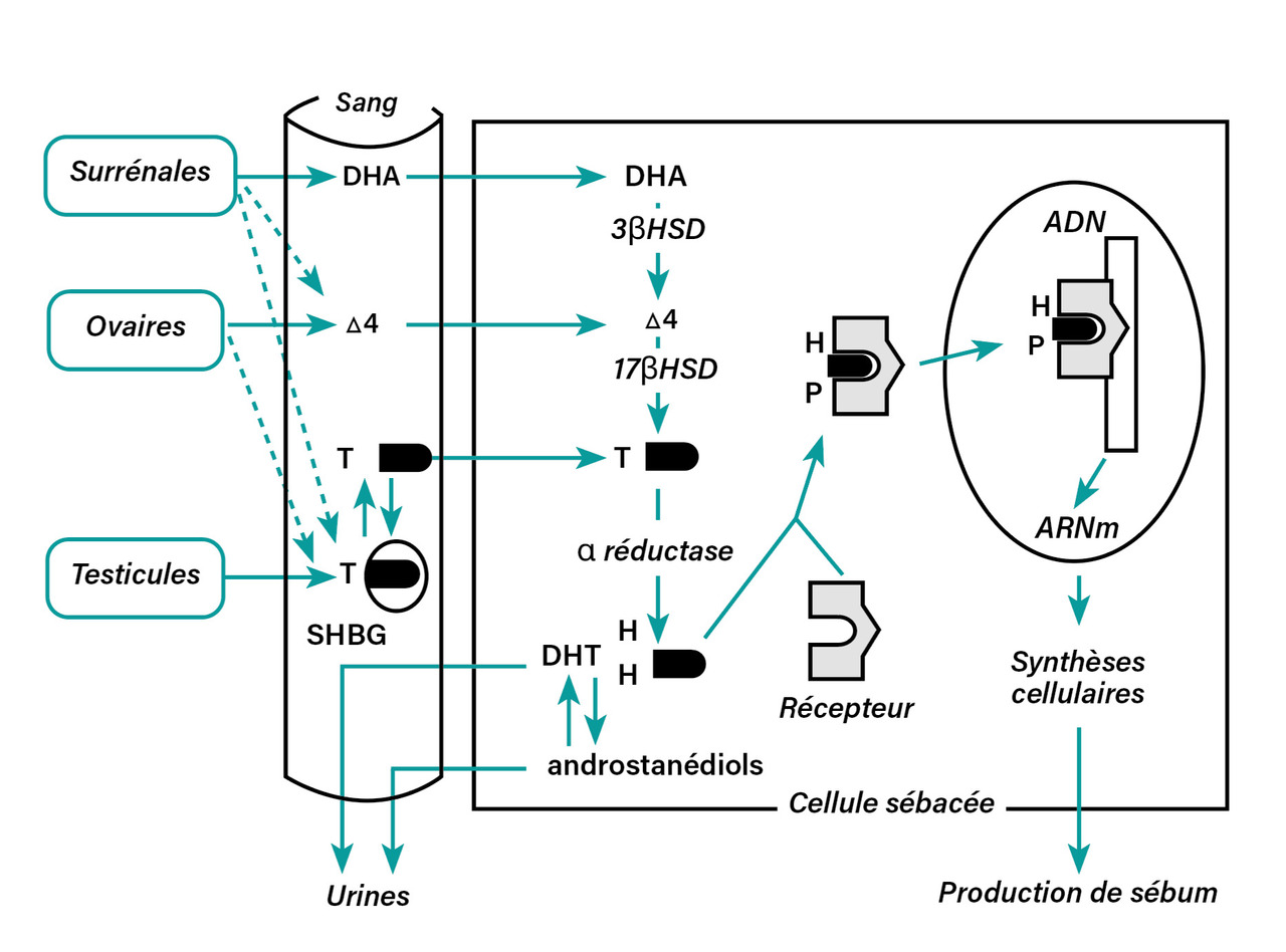 Chez les patientes acnéiques, alors que les taux d’androgènes sont le plus souvent normaux, il existe une hypersensibilité des récepteurs des androgènes des glandes sébacées mais aussi une hyperactivité du système enzymatique de la glande assurant la production intracellulaire d’androgènes en son sein. En effet, la testostérone libre circulante (seule hormone capable de pénétrer dans les sébocytes) est transformée, sous l’effet de la 5 -α réductase du sébocyte, en dihydrotestostérone qui va se fixer sur un récepteur spécifique du noyau, activant alors les gènes responsables de la production de sébum (fig. 1).2