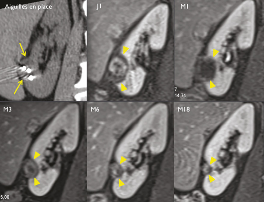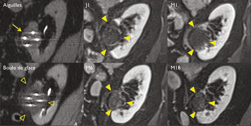 La cryoablation percutanée sous tomodensitométrie est une bonne alternative à la chirurgie partielle ou à la surveillance simple pour les petites tumeurs du rein de stade T1a chez les patients à risque. À la différence de la radiofréquence ou des micro-ondes, elle est parfaitement réalisable sous anesthésie locale exclusive au prix d’une faible morbidité, puisque cette technique diminue les risques opératoires et anesthésiques.