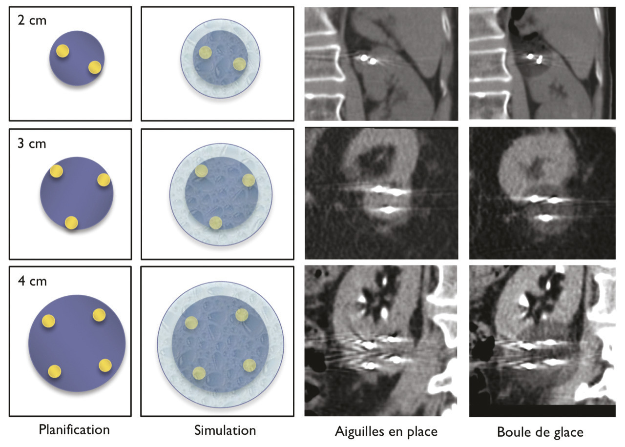 L’incidence du cancer du rein localisé et de petite taille est en permanente augmentation depuis plusieurs décennies. Cela s’explique en partie par l’essor de l’imagerie médicale puisque plus des deux tiers des cancers du rein sont découverts fortuitement au cours d’un examen d’ima- gerie réalisé pour une autre raison.1, 2 Le traitement de référence de ces petites tumeurs rénales de stade T1a (< 4 cm) est la chirurgie lorsqu’elle est possible. Le nombre de petites tumeurs traitées par néphrectomie élargie est en nette diminution, au profit de la néphrectomie partielle et des ablations percutanées.3 Cependant, la néphrectomie partielle n’est pas dénuée de compli- cations et reste complexe pour certaines tumeurs, en particulier les tumeurs centrales. Les techniques ablatives percutanées sont une option thérapeutique intéressante chez les patients qui ne sont pas de bons candidats à la chirurgie : lésions difficilement extirpables, patients les plus fragiles. Elles ont pour objectif de traiter les patients en diminuant la morbidité liée à une chirurgie conventionnelle. Elles consistent en la destruction du tissu tumoral in situ soit par échauf- fement (radiofréquence ou micro-ondes), soit par refroidissement tissulaire (cryoablation). Une des limites de ces traitements ablatifs par le chaud est leur caractère douloureux, nécessitant leur réalisation sous sédation consciente, voire sous anesthésie générale. La cryoablation percutanée permet, en revanche, de traiter les patients avec une anesthésie locale exclusive.