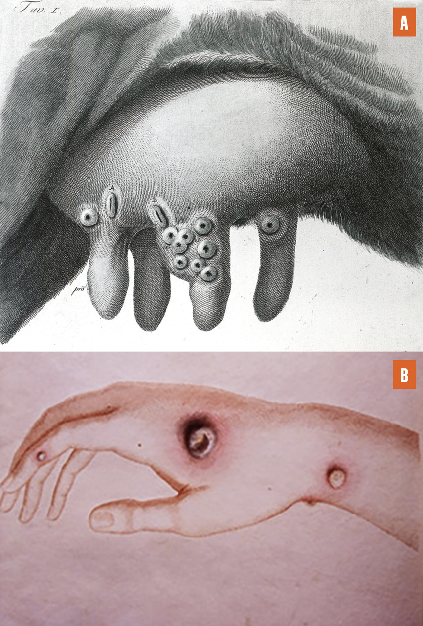 Peu d’hommes ont permis de sauver autant de vies humaines qu’Edward Jenner (1749 - 1823) [fig. 1], un médecin de campagne de Berkeley, près de Gloucester en Angleterre, qui pratiquait des inoculations. À l’origine de cette pratique, il avait remarqué que les personnes ayant souffert de la maladie des trayeurs étaient résistantes à l’inoculation et épargnées au cours des épidémies. Après vingt ans d’observations cliniques, il a démontré expérimentalement l’effet protecteur du cowpox contre la variole. En mai 1796, lors d’une épizootie de cowpox, une jeune trayeuse, Sarah Nelmes, présente des pustules sur les mains et les bras (fig. 2 A et B). À partir du pus de ces pustules, Jenner inocule un jeune garçon en bonne santé, James Phipps, 8 ans. Le 14 mai 1796, avec une lancette imprégnée de « matière », il pratique deux incisions superficielles sur l’un des bras de l’enfant. Après quelques jours, James présente des vésicules au point d’inoculation ainsi que des signes généraux (malaise, perte d’appétit et léger mal de tête), guérissant en quelques jours. Le 1er juillet 1796, Jenner inocule le jeune garçon avec du pus de varioleux. Il pratique plusieurs piqûres et incisions superficielles et n’observe aucune réaction. L’épreuve est réitérée quelques mois plus tard, puis après cinq ans, à nouveau sans aucune réaction. Il collige ainsi 23 cas similaires, confirmant la protection conférée par le pus de cowpox contre la variole. Il publie ses résultats à compte d’auteur dans un petit livre de 75 pages, intitulé An inquiry into the causes and effects of the variolæ vaccinæ (17 septembre 1798). Dès 1800, on nomme ce procédé « vaccination » (vacca, vache) et la lymphe « vaccine » (virus vaccinia).