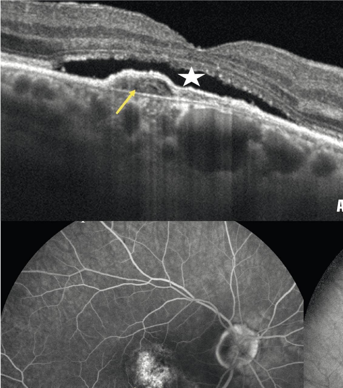 Dans la DMLA exsudative, les néovaisseaux sont visibles comme des lésions fusiformes hyper- réflectives, ainsi que leur activité : décollement séreux rétinien et logettes d’œdème intrarétiniennes (fig. 5 ).