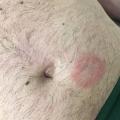 Après une incubation d’une durée variable – de quelques jours à deux mois –,2 des lésions souvent érythématosquameuses, circinées, avec une bordure active apparaissent. Elles siègent préférentiellement au niveau des zones de contact sexuel, comme le siège (fig. 1), le pubis, le scrotum, la racine des cuisses (fig. 2), le visage (notamment la barbe), mais peuvent également concerner d’autres zones du corps, comme les cuisses, l’abdomen (fig. 3), voire le tronc.1 - 3,7