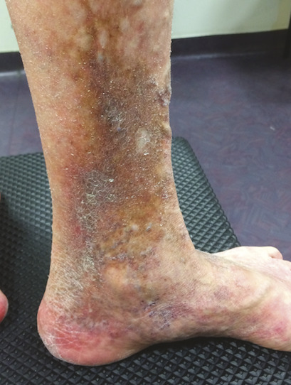 Ce retentissement tissulaire peut être plus important avec la survenue de troubles trophiques qui peuvent intéresser la peau et le tissu sous-cutané et sont classifiés C4 : dermite ocre qui apparaît au tiers inférieur de jambe (fig. 5 ), dermite de stase circonscrite en regard d’un trajet variqueux ou plus diffuse au niveau de la jambe et, dans les stades encore plus avancés, hypodermite scléreuse (C4b) siégeant au-dessus de la cheville au tiers distal et moyen de la jambe (fig. 6 et 7). Une atrophie blanche est aussi possible ; elle se traduit par une zone cicatricielle le plus souvent à la face médiale du tiers inférieur de la jambe.