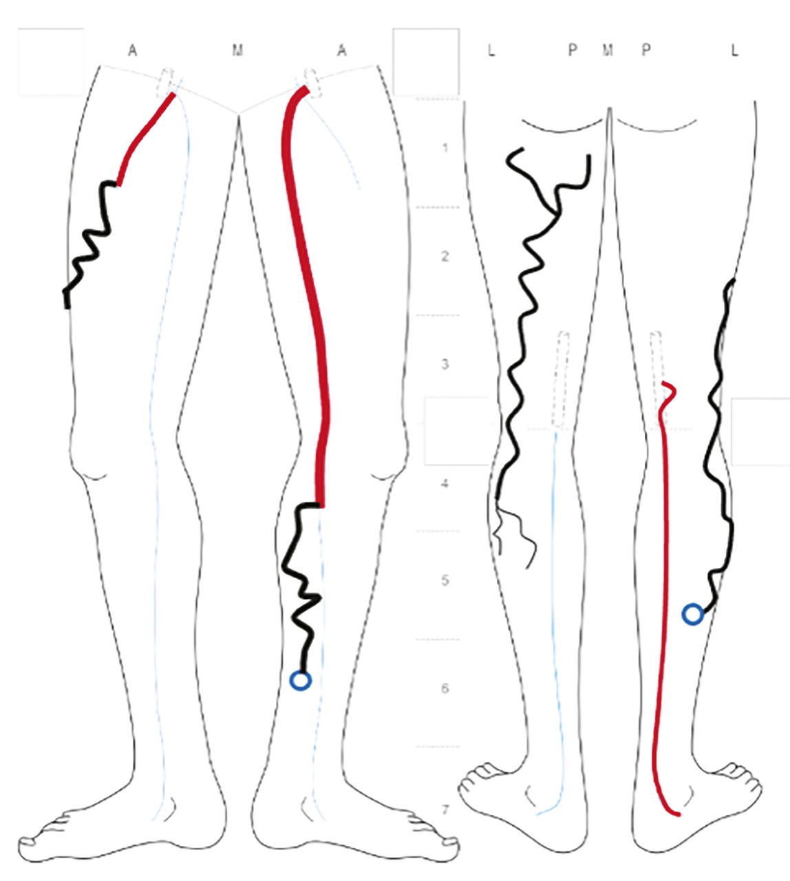 À l’issue de l’écho-Doppler et parallèlement au compte-rendu de l’examen, est élaborée une cartographie veineuse qui représente de façon graphique les données écho-anatomiques et hémodynamiques recueillies au cours de l’écho-Doppler, qui peuvent être particulièrement complexes. Cette cartographie est indispensable à la bonne réalisation technique des traitements interventionnels éventuellement décidés, au suivi thérapeutique et à l’analyse de l’évolutivité de la maladie variqueuse (fig. 1 7).