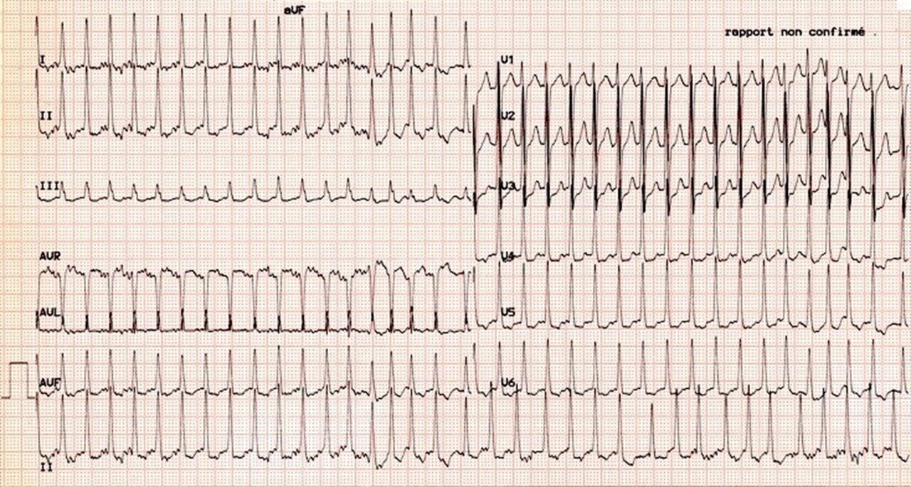 Le lendemain matin (J1), le patient décrit un épisode de palpitations. Vous enregistrez l’ECG suivant.