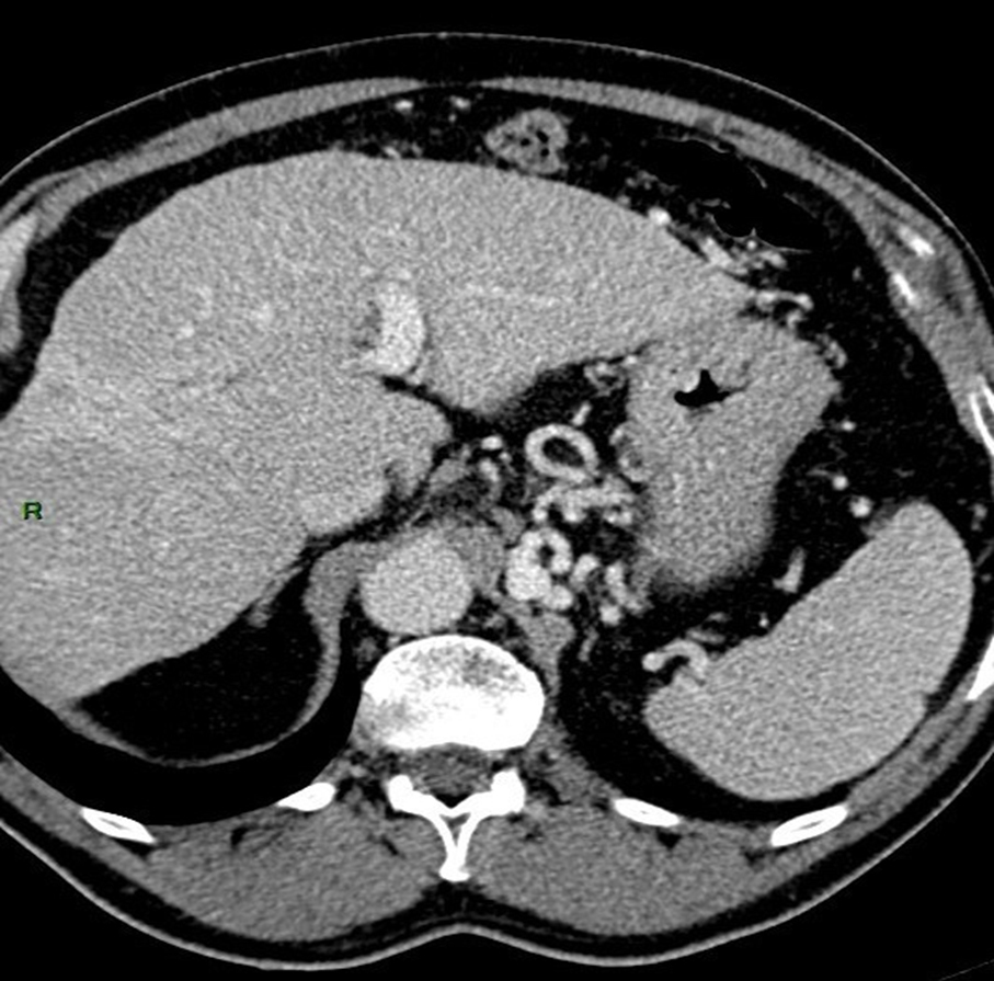 À l’examen clinique, vous retrouvez des signes d’insuffisance hépatocellulaire et d’hypertension portale associés à une hépatomégalie homogène à deux travers de doigts avec un bord inférieur tranchant. Le patient est marbré. Il existe une discrète ascite sans encéphalopathie associée. La palpation abdominale est indolore. Les constantes sont les suivantes : tension artérielle (TA) à 95/55 mmHg, pouls à 130/min, saturation en oxygène (SaO2) à 98 %, apyrétique.