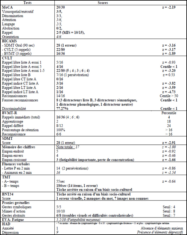 • membres supérieurs (droit/gauche) : biceps 5/4, triceps 5/3, extenseur poignet 5/3, pince pouce-index 5/3, interosseux 5/4,