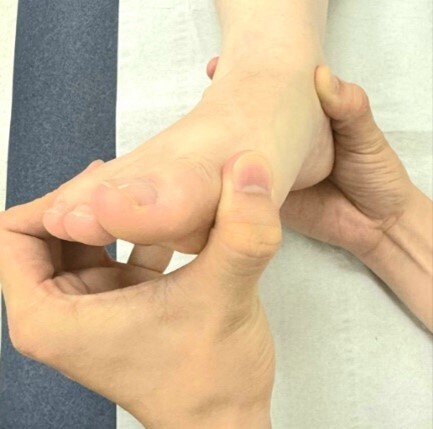 L’interligne tarsométatarsien de Lisfranc est testé par un mouvement de prono-supination ou en mobilisant la base de chaque métatarsien (fig. 2).