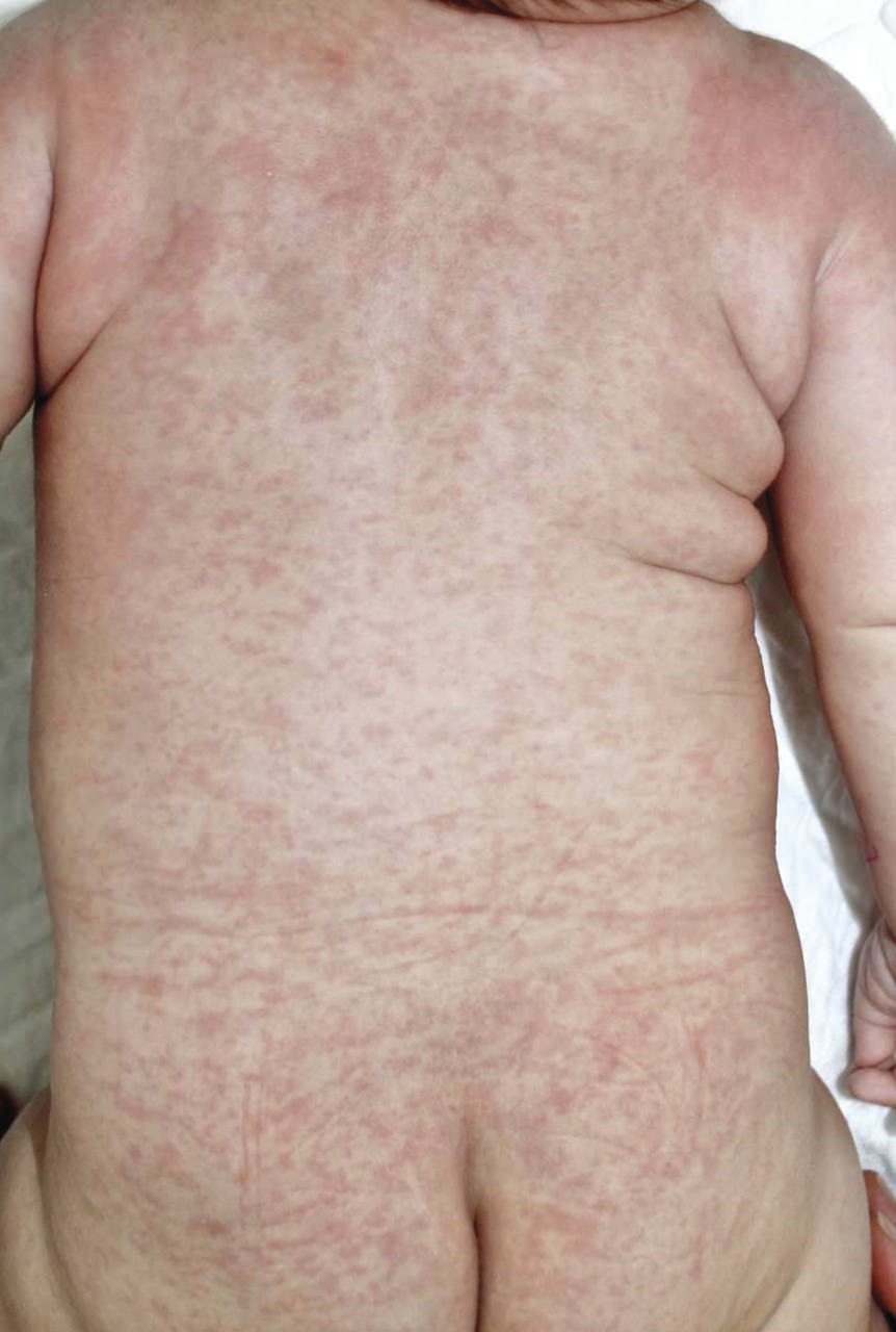 L’agent responsable est le rubivirus de la famille des Togaviridae. C’est une maladie bénigne chez la plupart des enfants, mais la survenue d’une rubéole chez une femme enceinte pendant le premier trimestre expose au risque de mort fœtale ou de rubéole congénitale. En France, on compte environ 30 femmes enceintes par an présentant une primo-infection et 5 ou 6 rubéoles congénitales.L’incubation est de quatorze à vingt et un jours avant l’éruption. L’éruption maculeuse, rose pâle, est à évolution descendante en vingt-quatre heures. Les signes associés sont des adénopathies nucales et occipitales postérieures, des arthralgies qui peuvent durer plusieurs mois. Il s’agit d’une affection peu fébrile (moins de 38,5 °C), sans altération de l’état général.