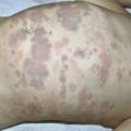 L’œdème aigu hémorragique du nourrisson se rencontre principalement chez les nourrissons et les enfants en bas âge. C’est une vascularite bénigne leucocytoplastique dont la cause est inconnue mais probablement virale. La triade clinique classique associe fièvre, œdème et présence de grandes macules purpuriques (rouge violacé) arrondies, au niveau du visage et des extrémités (fig. 20).