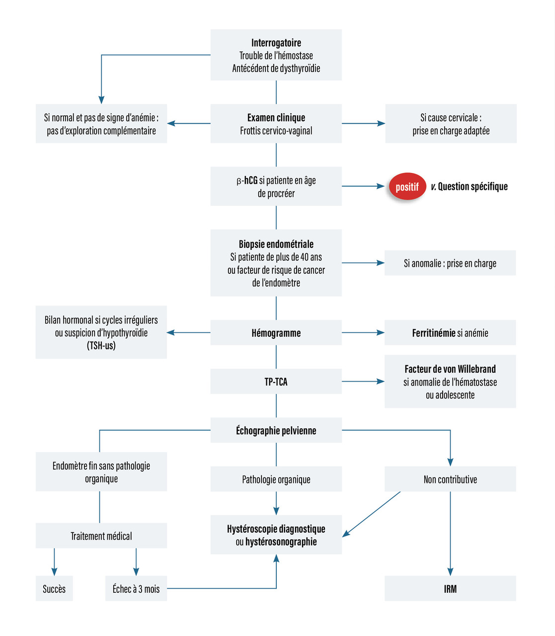 La patiente doit être examinée à la recherche de diagnostic différentiel (hématurie, rectorragie), et un examen gynécologique le plus complet possible doit être réalisé, à la recherche d’un cancer. Les explorations endo-utérines sont indispensables à la recherche d’une cause du saignement : échographie par voie endovaginale, biopsie endométriale, hystéroscopie.