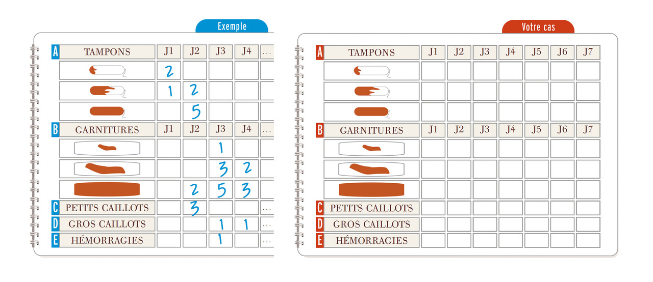 Il est demandé à la patiente si le saignement l’a obligée à changer de vêtements ou de draps ou encore si elle a remarqué des caillots. Elle est également interrogée sur le nombre de changes (garnitures ou tampons) utilisés sur une période donnée ainsi que leur imprégnation sanguine. Ces éléments doivent être regroupés sous forme d’un score (score de Higham [fig. 1]) qui permet d’évaluer de façon assez précise la déperdition menstruelle en cas de ménorragies. L’abondance du saignement peut aussi être évaluée par rapport aux règles normales.