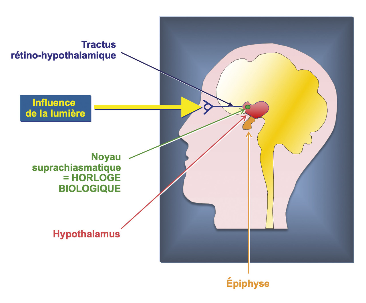 Le fonctionnement de l’horloge biologique est endogène et continue à s’exprimer, y compris lorsqu’un sujet est placé dans un environnement constant où rien ne distingue le jour de la nuit. L’activité circadienne des neurones du noyau suprachiasmatique est sous-tendue par le fonctionnement cyclique d’une dizaine de gènes dits « de l’horloge », responsables des rythmes d’activité électrique et biochimique des cellules avec une période proche de 24 heures.1 Mais l’horloge biologique est aussi influencée et synchronisée avec le cycle de rotation de la Terre autour de son axe, qui a une période d’exactement 24 heures. Le rythme de l’horloge endogène est cependant légèrement différent de 24 heures, en moyenne entre 23,5 et 24,5 heures chez le sujet sain.2 L’horloge doit donc être remise à l’heure quotidiennement pour être bien synchronisée avec le cycle jour-nuit. Chez les mammifères, c’est la lumière perçue par la rétine qui est le plus puissant synchroniseur de l’horloge circadienne.
