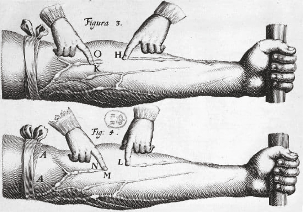 « Je pense, écrivait-il, que la nature les a créées pour retarder le cours du sang, pour l’empêcher de couler à flots à l’instar d’un fleuve, soit vers les mains, soit vers les pieds... » Harvey, dubitatif, reprit l’expérience à plusieurs reprises. Il s’agissait de mettre en place un garrot à la racine du bras et de faire serrer un bâton. Il constata que les veines se gonflaient de la périphérie vers le centre du corps, comme si le sang se dirigeait bien vers le cœur et non pas vers les doigts. Quand on lâchait ce garrot, les veines se vidaient brutalement (