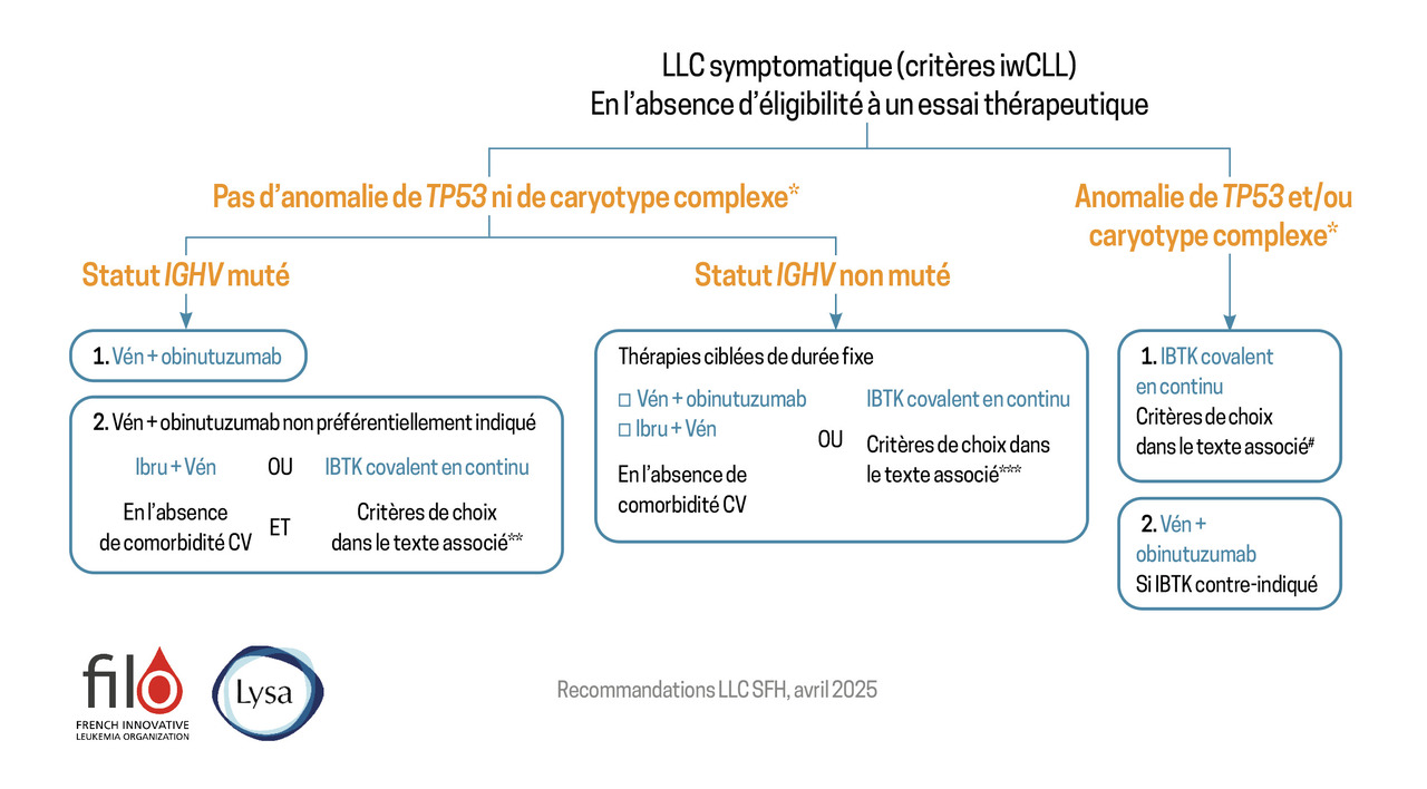 Le groupe d’experts de la LLC, réunis au sein du groupe FILO (French Innovative Leukemia Organization), réédite régulièrement ces recommandations en fonction des autorisations de mise sur le marché (AMM) des différentes molécules disponibles. La figure résume les recommandations de traitement de première ligne (où l’on constate que la place de la chimiothérapie classique a complètement disparu).