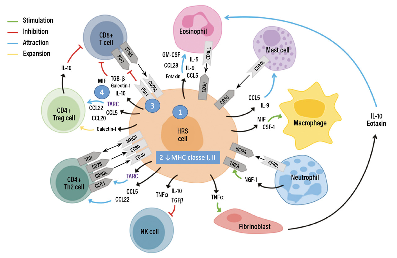 4. L’influence des cellules HRS sur leur micro-environnement par un réseau de cytokines, de chimiokines et de récepteurs solubles de la famille du TNFα, en mettant à leur profil les cellules réactionnelles.