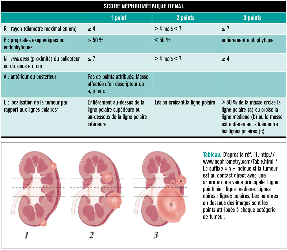 La chirurgie partielle du rein est techniquement plus complexe que la chirurgie radicale, et la difficulté technique peut être prédite à l’aide de scores pronostiques susceptibles de modifier les indications. Le score R.E.N.A.L. est le plus utilisé et classe la complexité du geste chirurgical en faible, modérée ou élevée, en fonction de la taille de la tumeur, de son caractère endo- ou exophytique, de sa proximité avec les cavités excrétrices, et de sa position antérieure ou postérieure et polaire ou médiorénale (v. tableau).11 Un score RENAL supérieur à 7 est significativement associé à un risque chirurgical plus élevé, avec des durées d’ischémie rénale per-opératoire allongées, davantage de marges chirurgicales positives, et un taux de complications post-opératoires augmenté.12