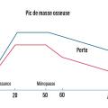 La valeur maximale de la densité minérale osseuse (DMO), appelée pic de masse osseuse, est atteinte en fin de croissance (entre 20 et 30 ans) et constitue le capital osseux. Ce capital est déterminé génétiquement (60 à 80 %) mais aussi par la puberté, les apports calciques et protéiques, et l’activité physique (fig. 1). Au moment de la ménopause, la carence œstrogénique est à l’origine d’une perte osseuse significative et rapide, pendant plusieurs années (- 2 à 3 % au rachis par an) avant de ralentir. Cette perte osseuse prédomine au niveau de l’os trabéculaire. Chez l’homme, l’andropause, survenant à un âge plus tardif, est associée à une perte osseuse plus linéaire.