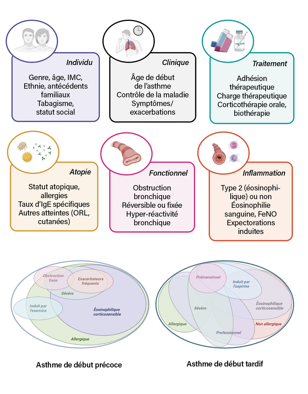 Les présentations cliniques d’asthme rencontrées en pratique clinique sont hétérogènes (fig. 2).9,10 Près d’une centaine d’études menées sur des cohortes de patients asthmatiques adultes a été réalisée dans le but de constituer des groupes homogènes de patients.11 Malgré les limites inhérentes à ces études (hétérogénéité, choix des variables incluses, etc.), certaines caractéristiques phénotypiques sont plus fréquemment décrites comme signifiantes : âge de survenue de la maladie, atopie, atteintes rhinosinusiennes associées et obésité. Les phénotypes d’asthme de l’adulte les plus fréquents sont décrits ci-après.