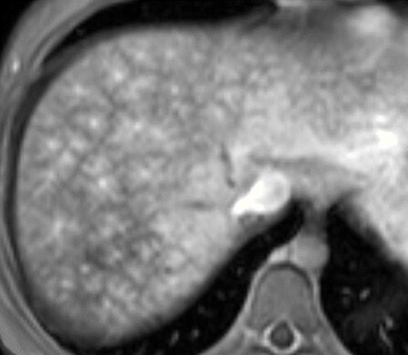 Le rehaussement (ou perfusion) en mosaïque du foie est très évocateur d’une maladie vasculaire. Il correspond à un rehaussement hétérogène (dit en feuille de fougère), surtout visible en périphérie et dans le foie droit, en particulier aux temps précoces (artériel et portal), puis qui s’homogénéise au temps tardif (fig. 3). Cet aspect est pathognomonique d’une dilatation sinusoïdale. Il doit donc faire rechercher toute cause de perturbation du retour veineux hépatique (thrombose des veines hépatiques, cardiopathie surtout droite, etc.).