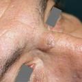Un homme de 64 ans consulte pour une formation papuleuse mamelonnée de couleur chair apparue il y a plus de 6 mois sur le nez. Une biopsie est réalisée.