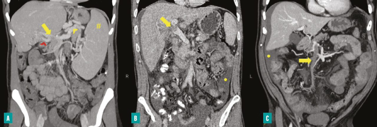 L’ischémie mésentérique est une urgence médico-chirurgicale, avec un risque de résection intestinale d’environ 35 % et une mortalité entre 10 et 30 %.3,23 Il s’agit d’une complication rare lorsque la TVP survient dans un contexte de cirrhose.6 La présentation clinique est superposable à celle de la thrombose portomésentérique aiguë (douleur abdominale, syndrome inflammatoire) et n’est pas spécifique. La persistance ou l’aggravation de la douleur malgré le traitement anticoagulant, l’apparition d’un iléus ou d’une hémorragie digestive doivent faire évoquer l’évolution vers une ischémie mésentérique, même si elle n’était pas présente sur l’imagerie initiale.23